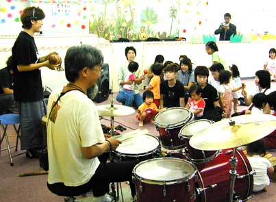 ![]() 続いてレッスンタイム。子供達にも実際に楽器に触れてもらいました。 「さあ、みんな好きな楽器を叩いてみて」と藤ノ木講師。 |