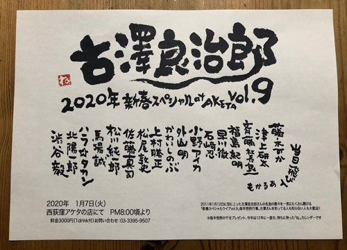 津上研太(sax) 鈴木徹大(gt) 望月英明(wb) 藤ノ木みか(vo.perc) 松尾敦史、福島紀明(dr) ゲスト 知ってる人にはなじみ深い9月5日は古澤良治郎さんの誕生日〜♪だった日です。縁のメンバーが集まってわいわいやれるの楽しみ!この日、アケタの店では、アケタトリオ(明田川荘之、上村勝正、石崎忍)をやっているので、古澤さんの魂は西荻を北に南に浮遊するでしょう。私も行ったり来たりできたらしようと思ってます。 |