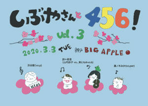 | 3月3日(火) PM8時頃〜 前売り ¥2500 当日 ¥2800 しぶやさんと456 ! ! ! |