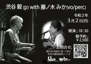 渋谷毅ソロ(ゲスト藤ノ木みか) 渋谷毅(p,うた) 藤ノ木みか(perc,うた) |