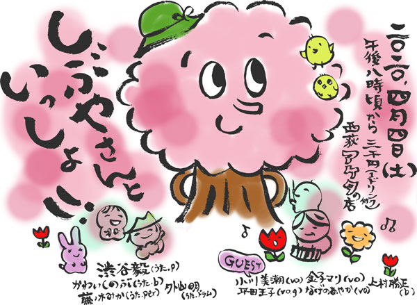 しぶいつレギュラー 渋谷毅(ピアノ、うた) かわいしのぶ(ベース、うた) 藤ノ木みか(パーカッション、うた) 外山明(ドラム、うた) ゲスト |